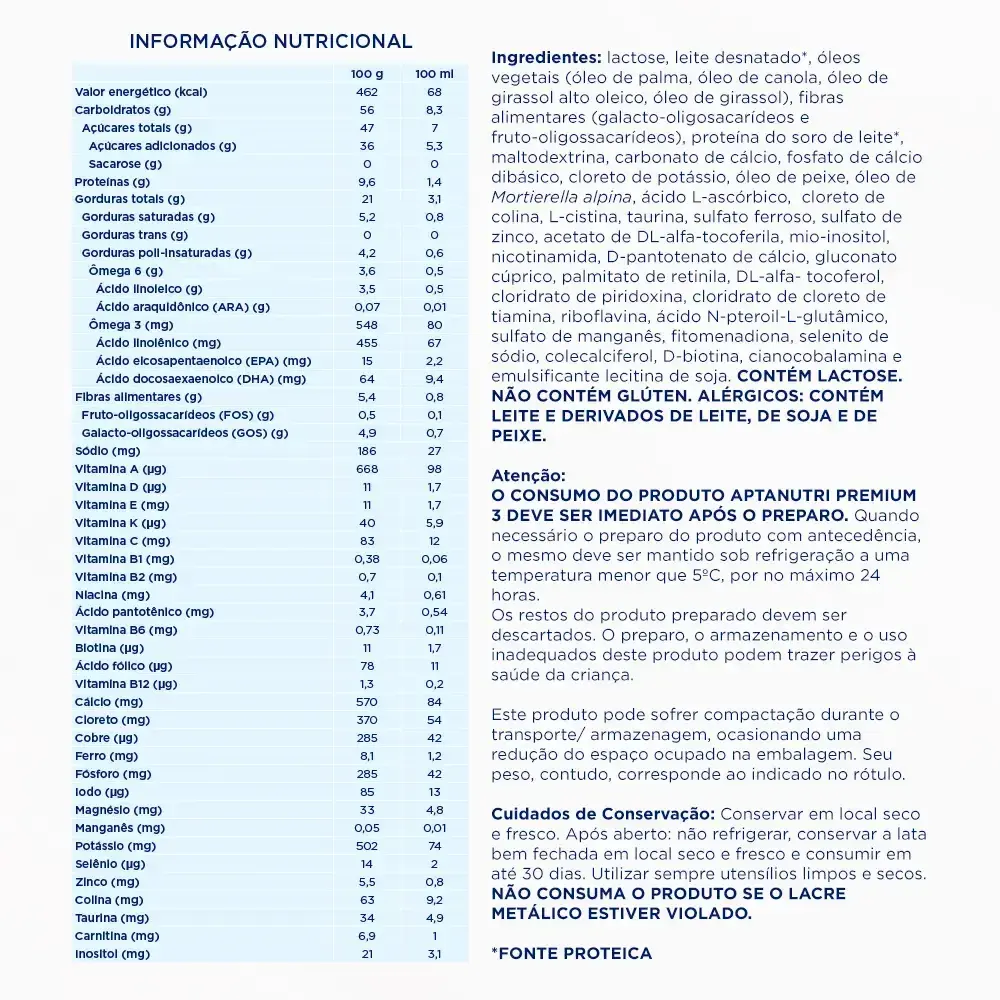 O Aptanutri Premium 3 é o antigo Aptamil Premium 3, fórmula infantil da Danone Nutricia desenvolvida para as necessidades das crianças brasileiras de primeira infância, a partir de 1 ano. Sua fórmula contém DHA e ARA, ácidos graxos das famílias ômega 3 e ômega 6, respectivamente, além dos exclusivos prebióticos Danone Nutricia (scGOS/lcFOS 9:1). A indicação de produtos deve ser sempre avaliada pelo profissional de saúde, caso a caso, conforme a situação clínica e nutricional do paciente. Consulte sempre seu profissional de saúde. INGREDIENTES ngredientes: lactose, leite desnatado*, óleos vegetais (óleo de palma, óleo de canola, óleo de girassol alto oleico, óleo de girassol), fibras alimentares (galacto-oligosacarídeos e fruto-oligossacarídeos), proteína do soro do leite*, maltodextrina, carbonato de cálcio, fosfato de cálcio dibásico, cloreto de potássio, óleo de peixe, óleo de Mortierella alpina, ácido L-ascórbico, cloreto de colina, L-cistina, taurina, sulfato ferroso, sulfato de zinco, acetato de DL-alfa-tocoferila, mio-inositol, nicotinamida, D-pantotenato de cálcio, gluconato cúprico, palmitato de retinila, DL-alfa- tocoferol, cloridrato de piridoxina, cloridrato de cloreto de tiamina, riboflavina, ácido N-pteroil-L-glutâmico, sulfato de manganês, fitomenadiona, selenito de sódio, colecalciferol, D-biotina, cianocobalamina e emulsificante lecitina de soja. CONTÉM LACTOSE. NÃO CONTÉM GLÚTEN. ALÉRGICOS: CONTÉM LEITE E DERIVADOS DE LEITE, DE SOJA E DE PEIXE. *fonte proteica