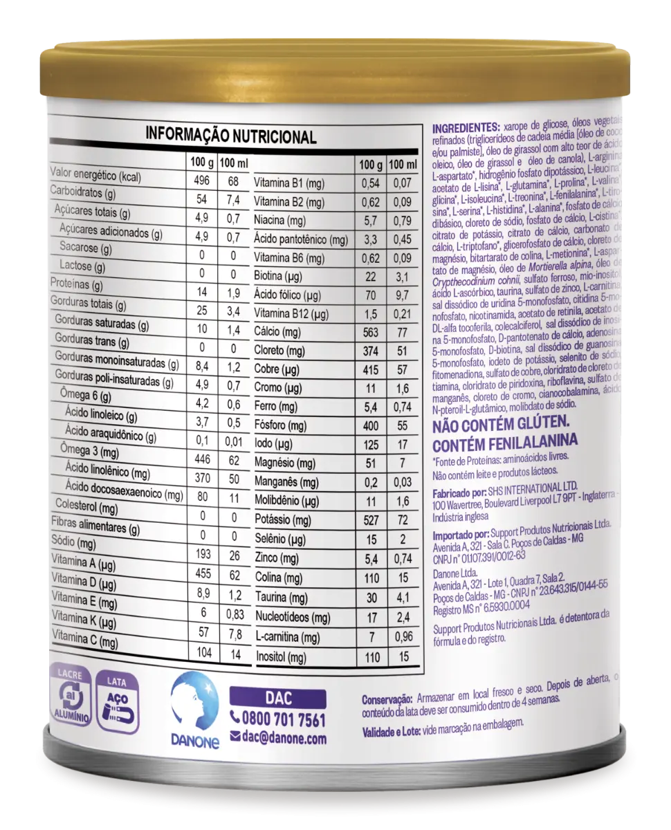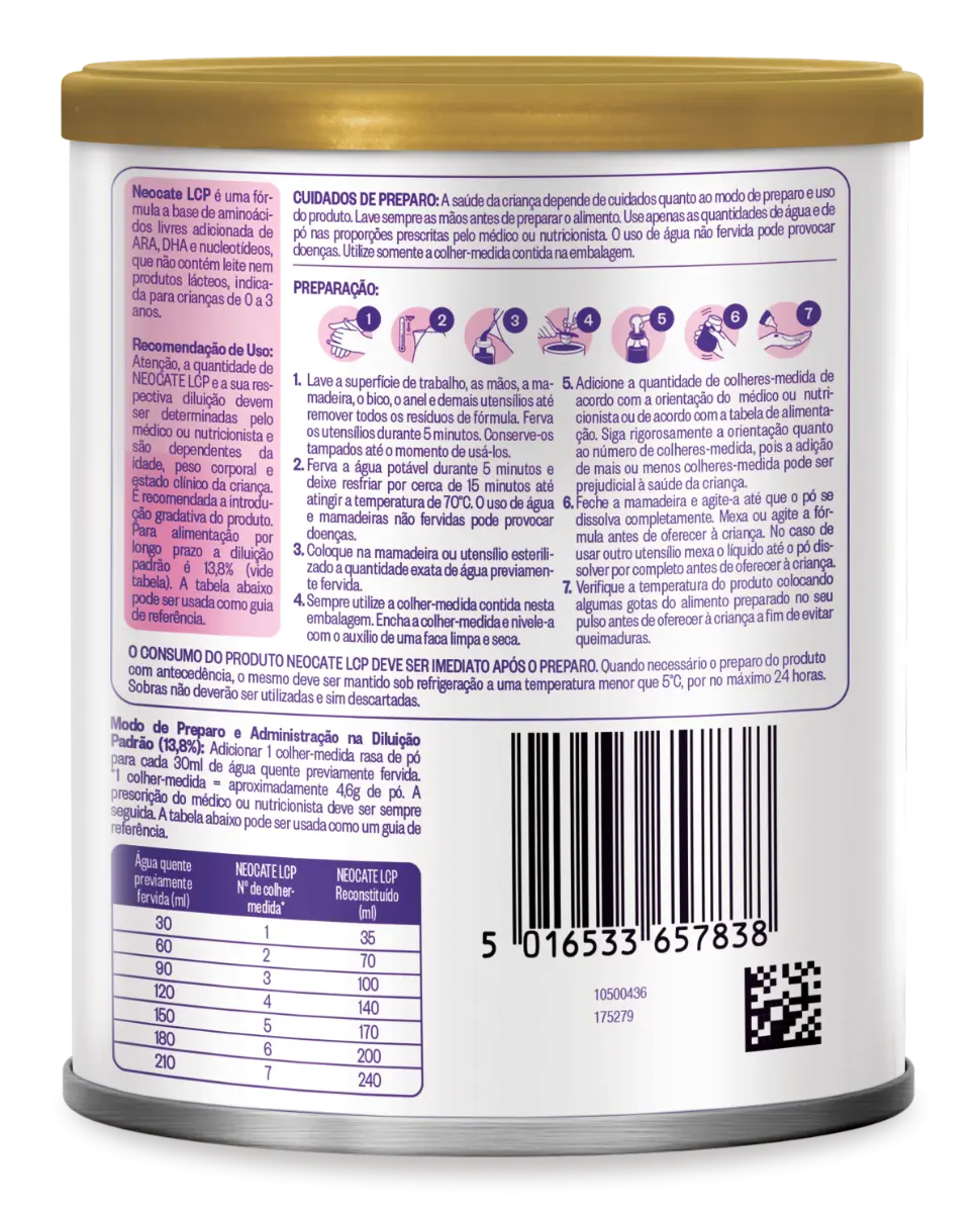 O Neocate LCP é uma fórmula infantil em pó à base de aminoácidos livres, para lactentes e crianças de primeira infância de 0 a 36 meses de partida e seguimento. Nutricionalmente completa e isenta de proteínas lácteas, foi formulada para necessidades dietoterápicas específicas, com restrição de lactose. É indicada para crianças de 0 a 3 anos Não contém leite e produtos lácteos. A indicação de produtos deve ser sempre avaliada pelo profissional de saúde, caso a caso, conforme a situação clínica e nutricional do paciente. Consulte sempre seu profissional de saúde. INGREDIENTES Xarope de glicose, óleos vegetais refinados (óleo de girassol, triglicerídeos de cadeia média [óleo de coco e/ou palmiste] e óleo de canola), fosfato de cálcio dibásico, L-arginina L-aspartato*, L-leucina*, citrato tripotássico, acetato de L-lisina*, L-glutamina*, L-prolina*, L-valina*, glicina*, L-isoleucina*, L-treonina*, L-fenilalanina*, L-tirosina*, L-serina*, L-histidina*, L-alanina*, cloreto de sódio, L-cistina*, cloreto de magnésio, L-triptofano*, bitartarato de colina, L-metionina*, citrato de cálcio, L-aspartato de magnésio, óleo de Mortierella alpina, óleo de Crypthecodinium cohnii, inositol, vitamina C, taurina, sulfato ferroso, sulfato de zinco, L-carnitina, sal dissódico de uridina 5-monofosfato, citidina 5-monofosfato, niacina, sal dissódico de inosina 5-monofosfato, adenosina 5-monofosfato, pantotenato de cálcio, vitamina E, sal dissódico de guanosina 5-monofosfato, sulfato de manganês, vitaminas B1 e B6, sulfato de cobre, vitaminas B2 e A, iodeto de potássio, ácido fólico, cloreto de cromo, vitamina K, selenito de sódio, molibdato de sódio, biotina, vitaminas D e B12, emulsificante ésteres de mono e diglicerídeos de ácidos graxos com ácido cítrico e antioxidante mistura concentrada de tocoferóis. NÃO CONTÉM GLÚTEN. CONTÉM FENILALANINA. NÃO CONTÉM LEITE E PRODUTOS LÁCTEOS.