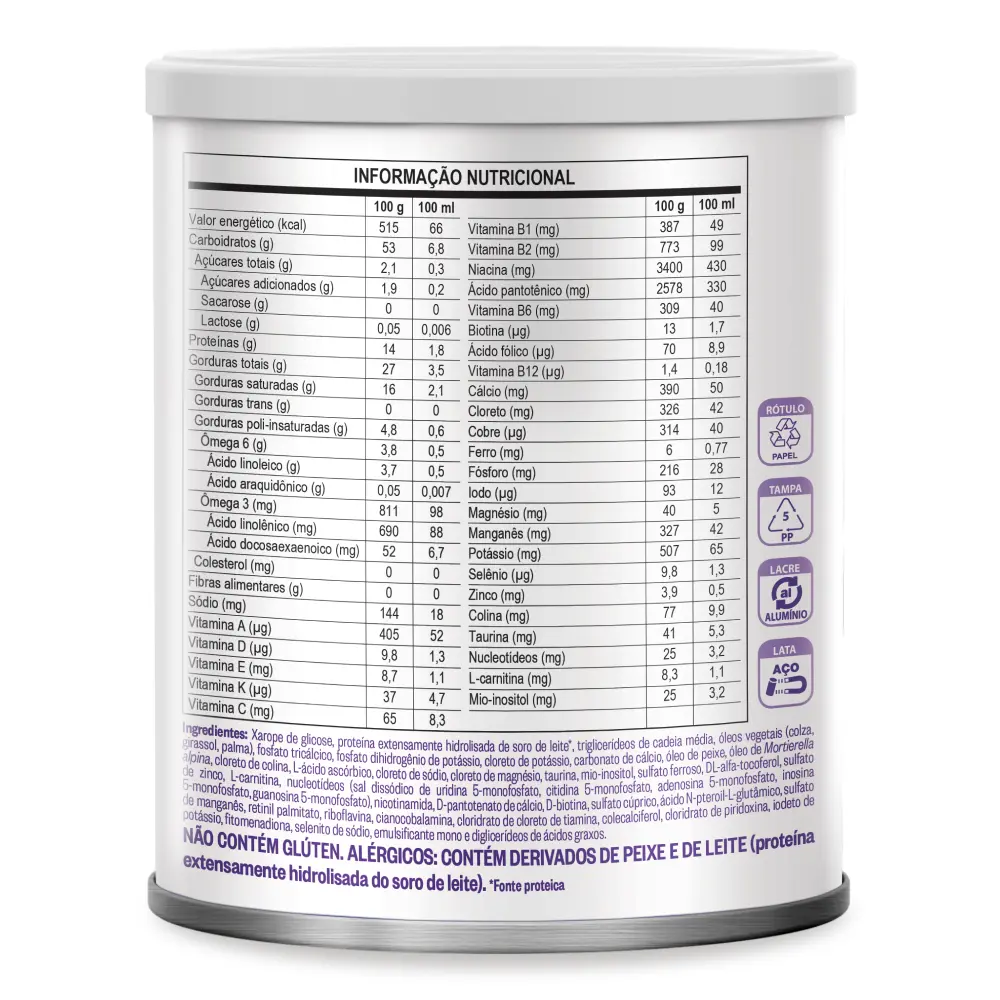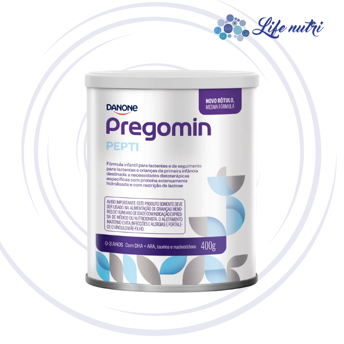 O Pregomin Pepti é uma fórmula Infantil em pó hipoalergênica, desenvolvida pela Danone para lactentes e crianças de primeira infância de 0 a 36 meses com necessidades dietoterápicas específicas: com restrição de lactose e com proteína extensamente hidrolisada. A indicação de produtos deve ser sempre avaliada pelo profissional de saúde, caso a caso, conforme a situação clínica e nutricional do paciente. Consulte sempre seu profissional de saúde. A Organização Mundial de Saúde (OMS) recomenda que, até o 6° mês de vida, o leite materno seja oferecido como fonte exclusiva de alimentação do bebê, podendo ser mantido como parte da alimentação de crianças até os 2 anos de idade ou mais. A INDICAÇÃO DEVE SER SEMPRE AVALIADA PELO PROFISSIONAL DE SAÚDE, CASO A CASO, CONFORME A SITUAÇÃO CLÍNICA E NUTRICIONAL DO PACIENTE. CONSULTE SEMPRE SEU PROFISSIONAL DE SAÚDE. INGREDIENTES Xarope de glicose, proteína hidrolisada do soro de leite, triglicerídeos de cadeia média, óleos vegetais (colza, girassol, palma), fosfato tricálcico, fosfato dihidrogenado de potássio, cloreto de potássio, carbonato de cálcio, óleo de peixe, óleo de fungos (Mortierella alpina), cloreto de colina, vitamina C, cloreto de sódio, cloreto de magnésio, taurina, inositol, sulfato ferroso, vitamina E, sulfato de zinco, L-carnitina, uridina, citidina, adenosina, inosina, niacina, d-pantotenato de cálcio, guanosina, d-biotina, sulfato de cobre, ácido fólico, sulfato de manganês, vitaminas A, B2, B12, B1, D, B6, iodeto de potássio, vitamina K, selenito de sódio, emulsificante, mono e diglicerídeos de ácidos graxos. NÃO CONTÉM GLÚTEN.